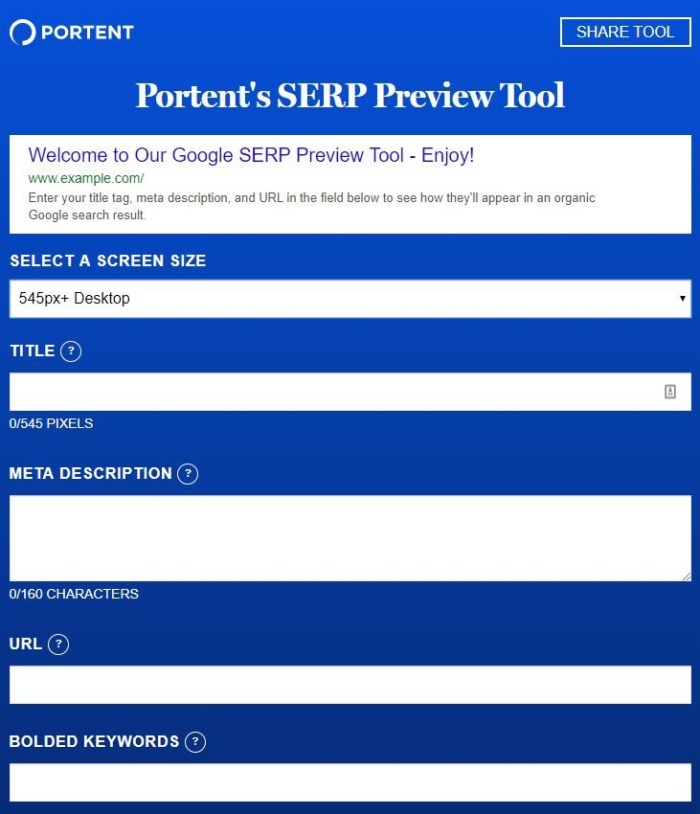 Portent is a customized tool for both new and experienced professionals, where they can get the customized SERP simulator preview and errors for meta tags and URLs Export results are available to work offline.